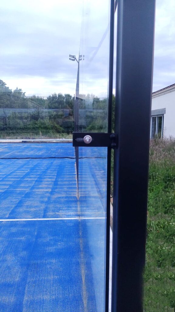 Les poteaux de lumière en arc ont été installés avec précision, et les finitions des fixations des vitres ont été réalisées de manière à ne pas interférer avec la vue du court. Ces finitions de haute qualité garantissent à la fois la sécurité et une esthétique épurée du terrain.