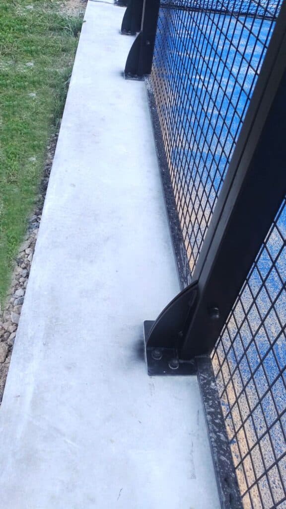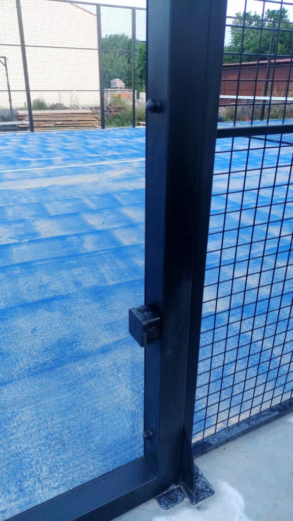 Le terrain a été livré entièrement finalisé, avec les poteaux de lumière en arc installés et les fixations des vitres de protection soigneusement intégrées. Les fixations discrètes permettent une vue dégagée sur le court, améliorant l’expérience visuelle et esthétique.