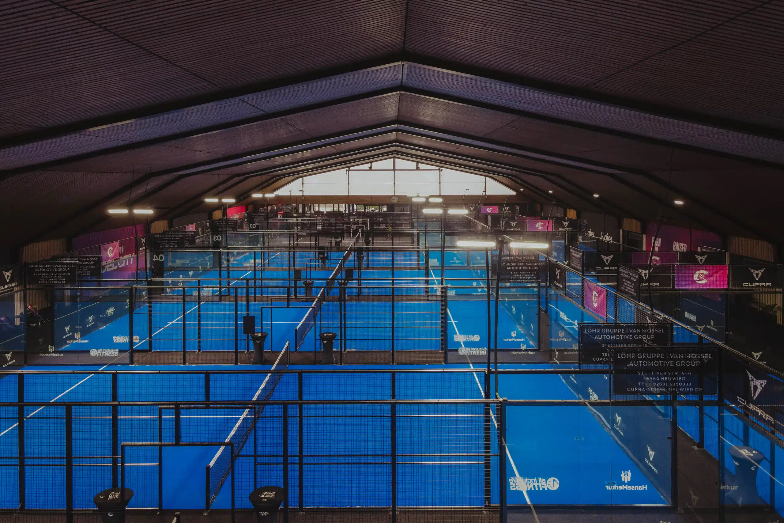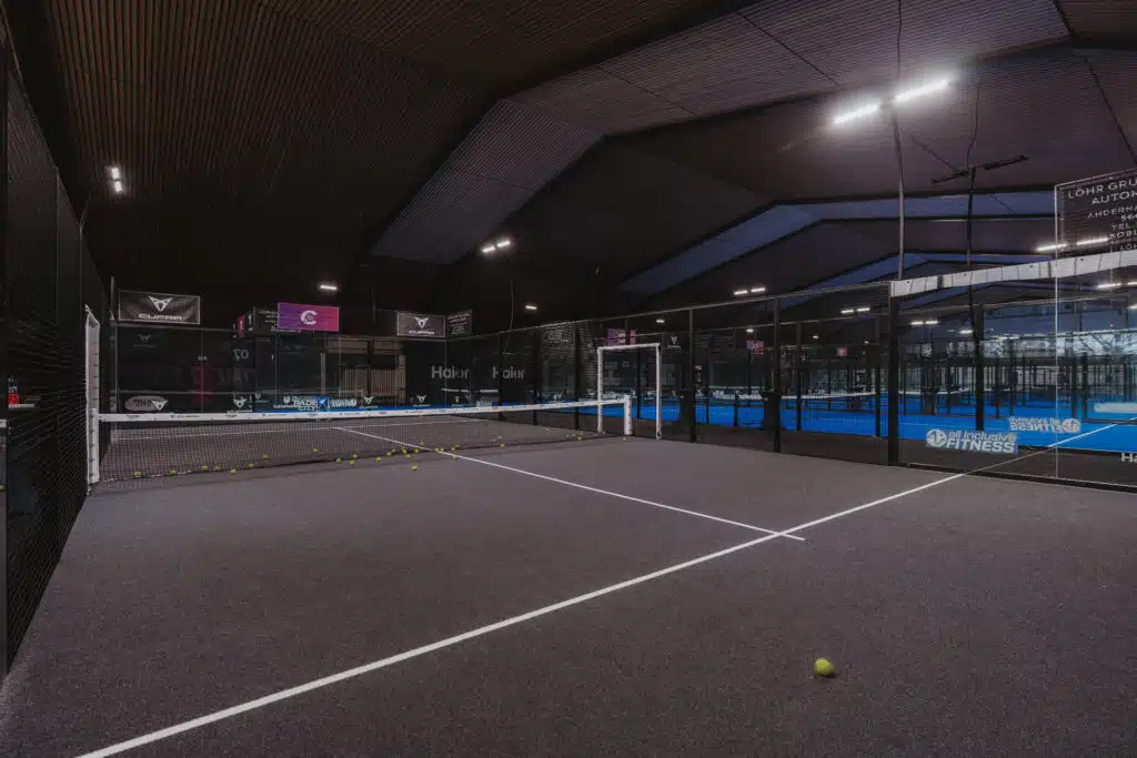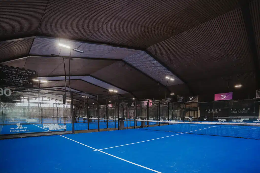 Pour ce nouveau complexe indoor à Andernach, PADEL CITY a fait le choix d’alterner terrains bleus et terrains noirs, créant une identité visuelle moderne et impactante.